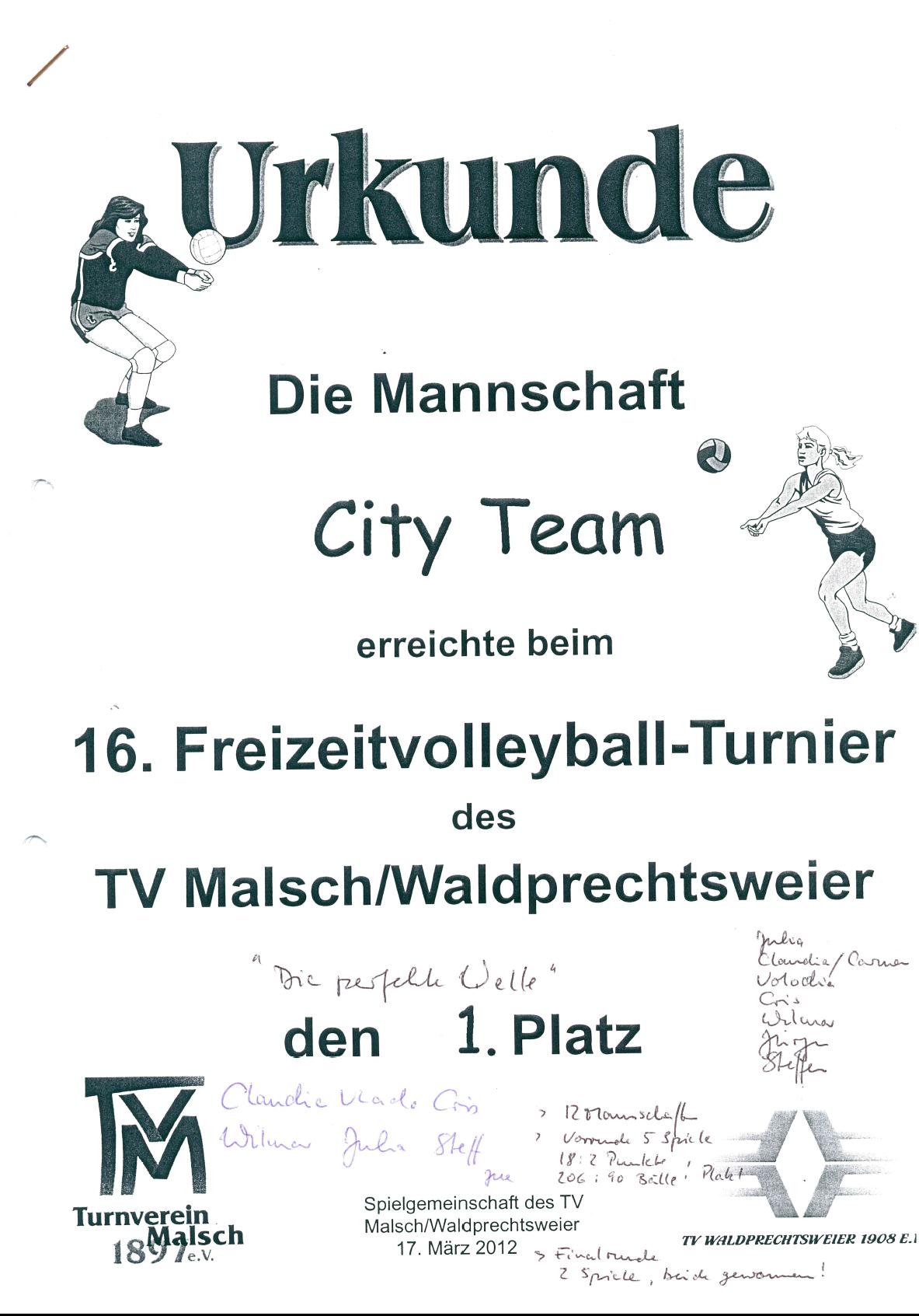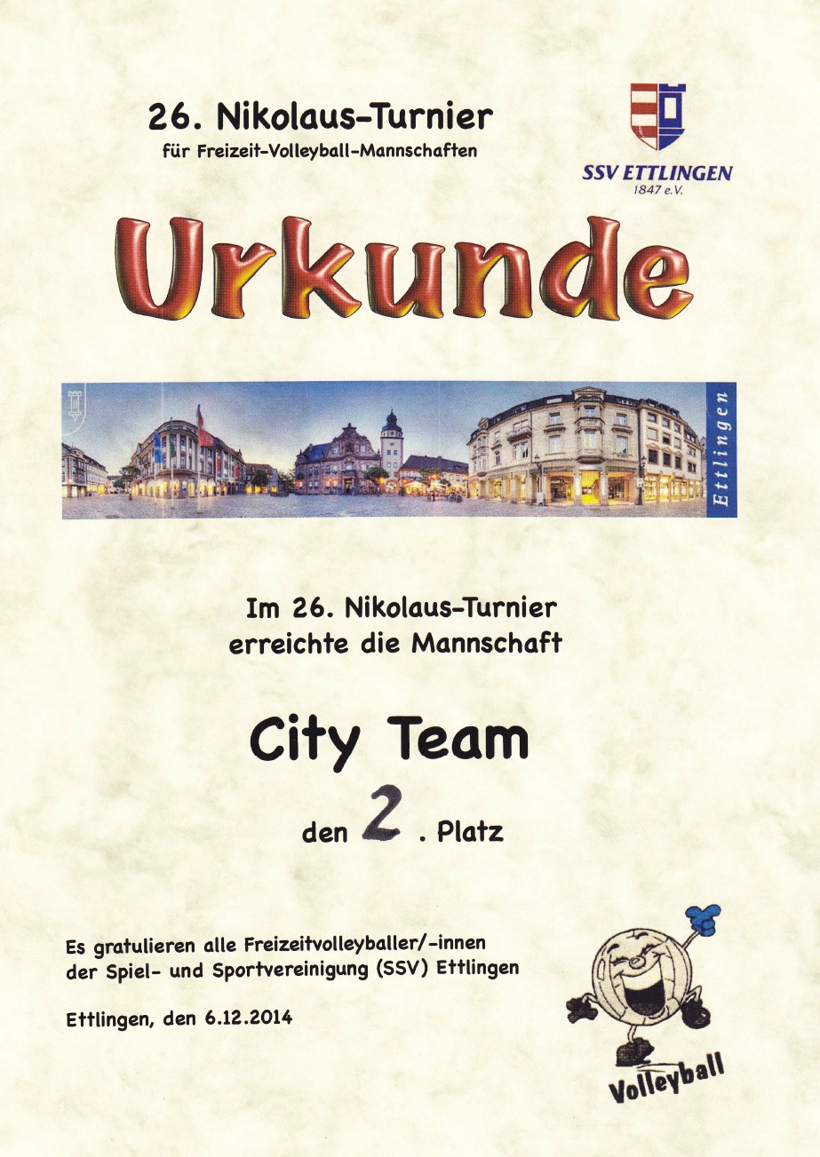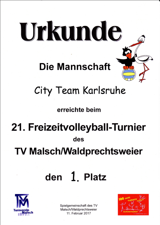 Ein Höhepunkt des Turnierjahres ist immer das Turnier in Malsch, mit anschließend der besten Lasagne überhaupt von Herta bei Volodia zu Hause. 2010 wurden wir dort allerdings nach einem heißumkämpften Endspiel nur zweite – die Siegermannschaft waren unsere Gäste und Freunde Volodias aus Rumänien, ehemalige Ligaspieler, die eigens für dieses Turnier angereist sind. Es gab bei der Siegerehrung sogar ein Grußwort der Gemeinde Malsch, Wimpel und Geschenke wurden völkerverbindend ausgetauscht. Ein schöner Moment der unterstreicht: egal wie alt Du bist, ob Professor oder Student, In- oder Ausländer – auf dem Spielfeld zählt nur der Ball! Einer, den wir bei dem Nikolausturnier in Ettlingen gewonnen haben, ist als Glücksbringer bei Turnieren immer dabei.