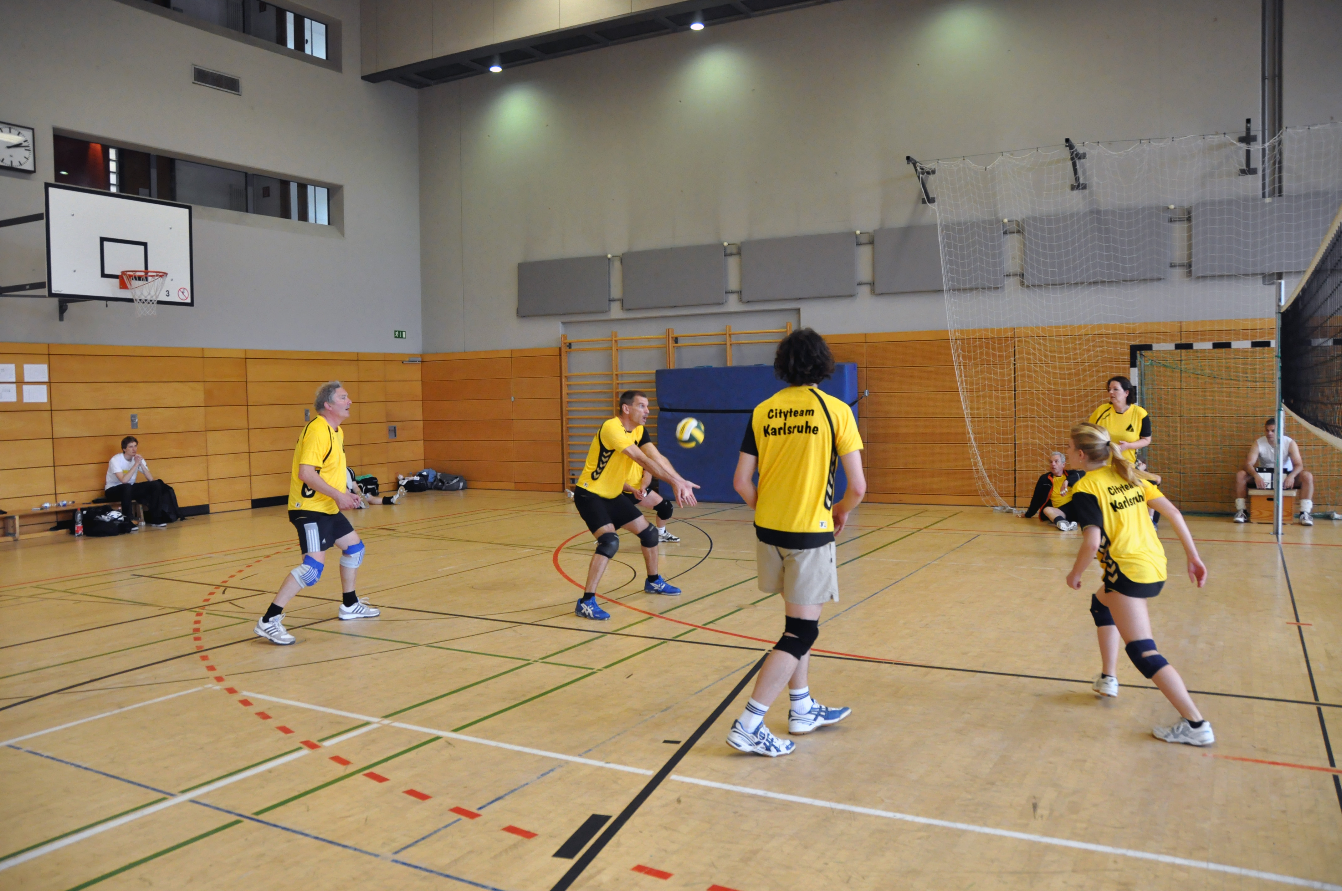 Und so nutzen wir unsere vielen Kontakte zur Karlsruher Volleyball-Szene. Schnell schafften wir es, Gastspiele mit Karlsruher Vereinsmannschaften zu vereinbaren. Fast jede Woche konnten wir spielen – ein erster grosser Erfolg auf dem Weg zu einer (inzwischen festen) Spielstätte. Und ein toller Beweis für die vielen Verbindungen, die Sport untereinander schaffen kann !